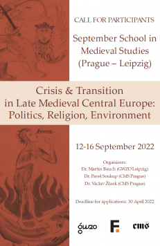 Politics – Religion – EnvironmentThe organizers invite Ph.D. students to apply for a five-day September School in Medieval Studies that will explore the phenomenon of the so-called „Crisis of the Late Middle Ages“ in a Central European context from the perspective of political, environmental, and religious history.